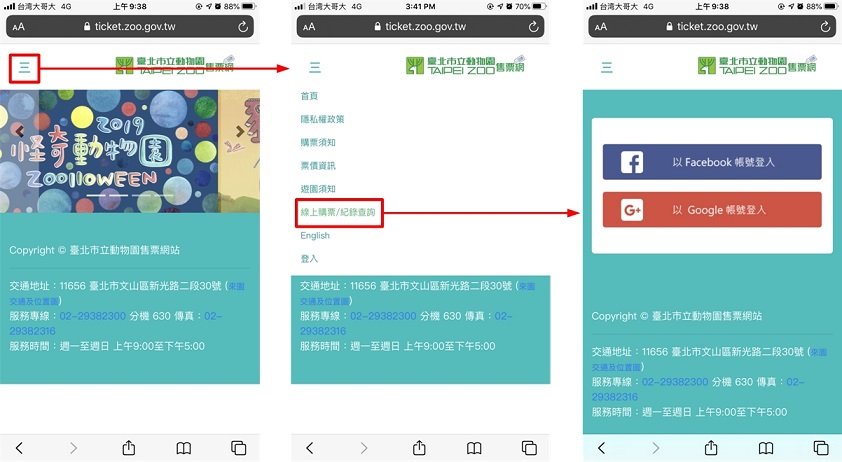 1. 於動物園售票網首頁,選擇「線上購票/紀錄查詢」,您將可選擇以Facebook或Google帳號登入動物園售票網