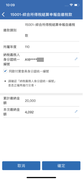 掃描稅單 QR code 後,進入繳稅資料頁,您可以繳納納稅義務人本人或代繳他人稅款。