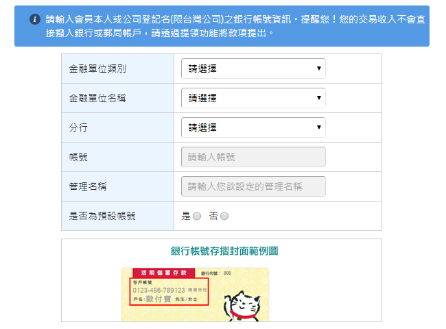銀行帳戶驗證:請填寫您本人在台灣辦理的銀行帳戶資訊。