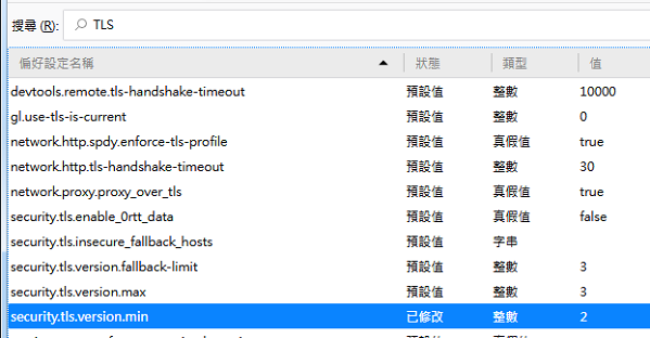 3.在搜尋列上搜尋【tls】,會出現相關設定,找到【security.tls.version.min】選項,並點選以開啟